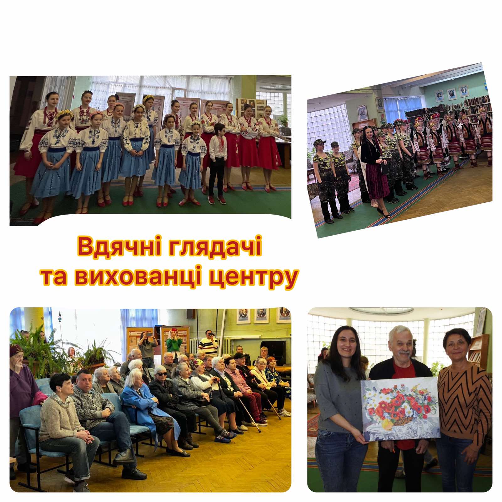 Такі зустрічі відбуваються раз на місяць. В пансіонаті настільки вдячні глядачі, що хочеться ще не раз до них завітати. Присутніх радували своїм мистецтвом: народний художній колектив дівочий танцювальний ансамбль «Слов’яночка», керівник заслужений артист України Андрій Шелудько; вокальний ансамбль народного співу «Десняночка», керівник Вікторія Мякота та танцювальний ансамбль «Візерунок», керівник Вікторія Васильєва. Дякуємо дітям, батькам та керівникам за чудовий концерт!! Віримо, що ще не раз зустрінемось з нашими вдячними шанувальниками!!