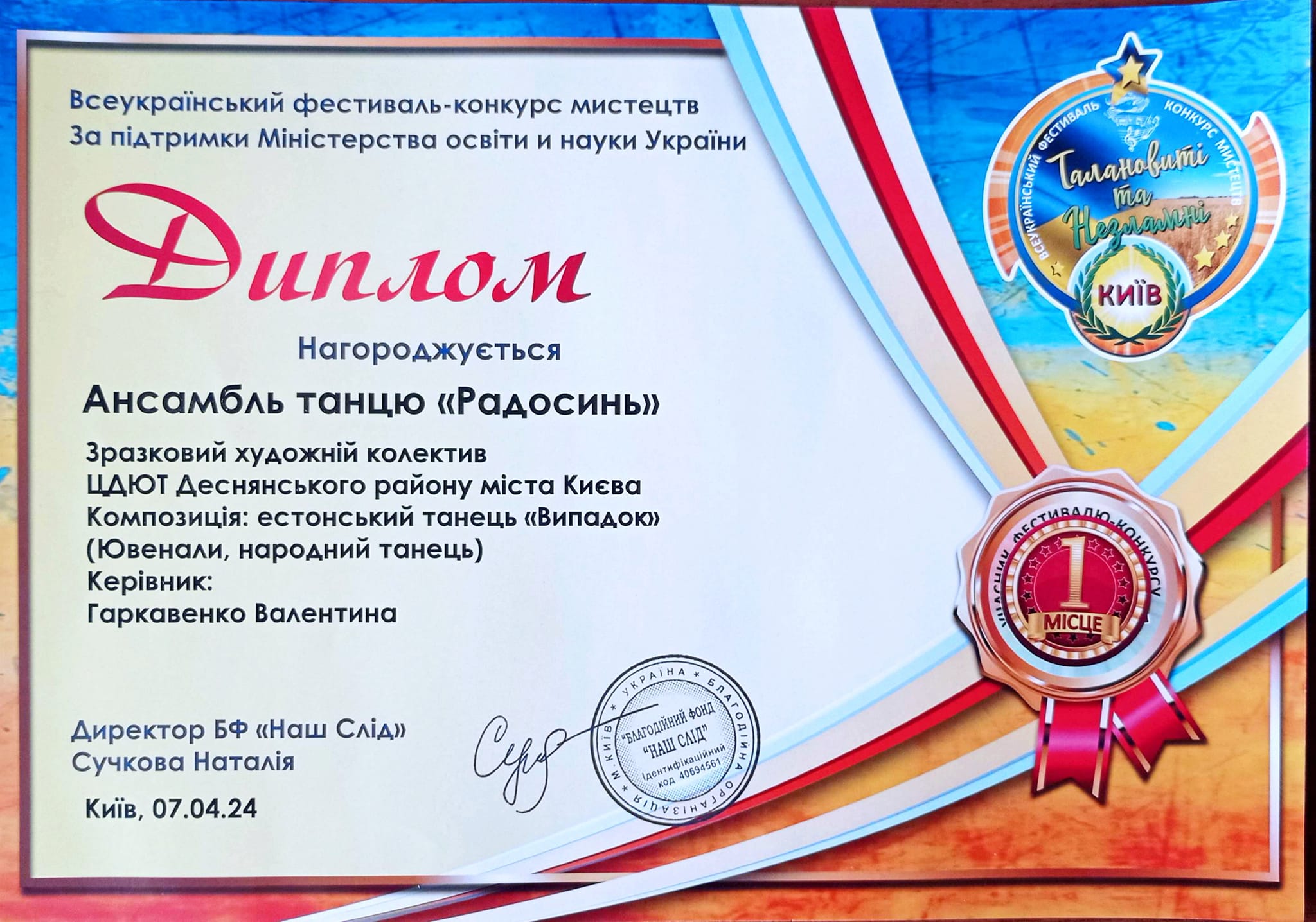 7 квітня 2024 року зразковий художній колектив ансамбль танцю «Радосинь» Центру дитячої та юнацької творчості Деснянського району міста Києва під керівництвом Валентини Гаркавенко брав участь у Всеукраїнському фестивалі-конкурсі мистецтв «Талановиті та незламні». На розсуд журі ансамбль представив два номери: естонський танок «Випадок» і отримали І місце, а болгарський танець «Коло» здобув ІІ місце.
