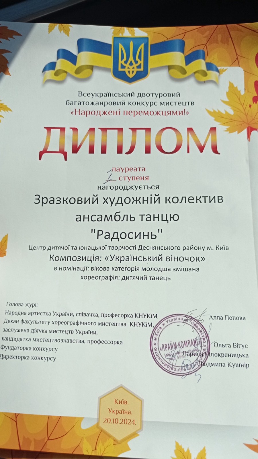 дівочого танцювального ансамблю «Словʼяночка (керівник Наталія Шелудько, хореограф Яна Матковська);